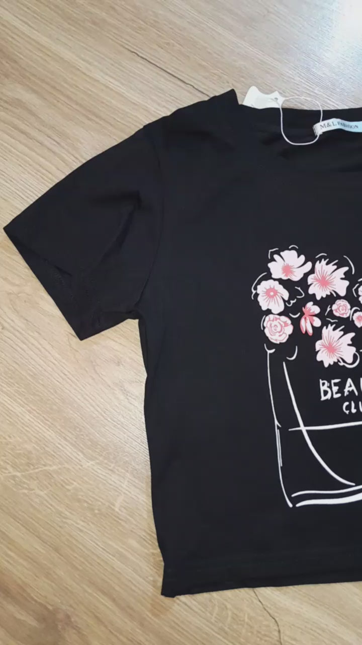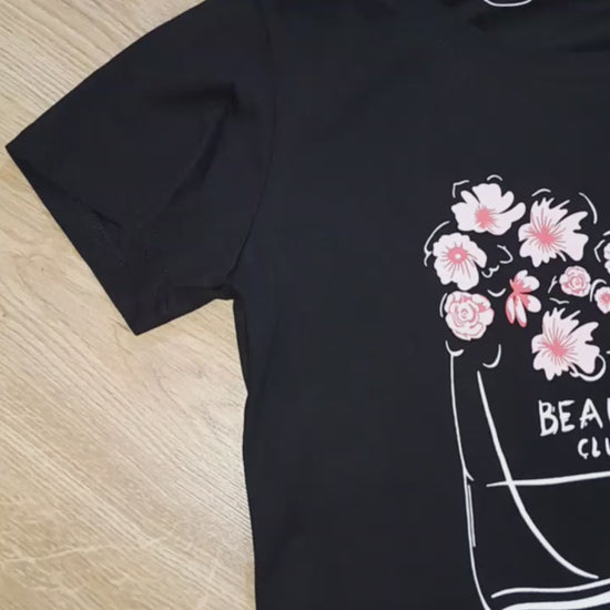 La elegancia de la pieza reside en su gráfica central, que evoca un estilo naïf y sofisticado a la vez. El diseño presenta una estilizada composición floral con delicadas flores rosadas de cerezo sobre un fondo oscuro, combinadas con la ilustración de un frasco de perfume vintage y la leyenda "BEAUTY CLUB".