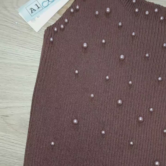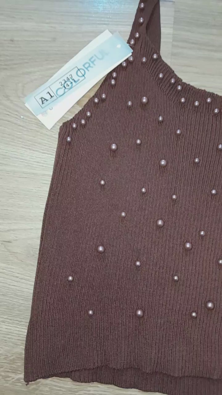 Confeccionado en un tejido de punto acanalado de tono marrón chocolate profundo (similar al cacao), la textura del cuerpo ofrece una estructura ceñida y favorecedora. La pieza es elevada por una delicada aplicación de pequeñas perlas o cuentas metálicas que salpican elegantemente el torso de forma dispersa, imitando un cielo estrellado. Este detalle se extiende con sofisticación a lo largo de los tirantes.