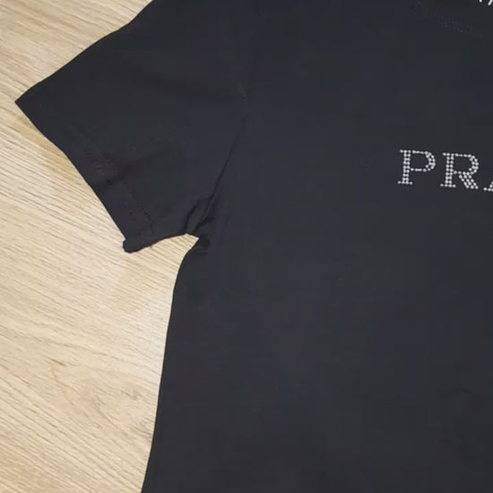 La elegancia de la pieza reside en su simplicidad elevada, realzada únicamente por el icónico logotipo PRADA centrado en el pecho. Presentado en un sutil tono plateado o blanco, el emblema se convierte en un toque de sofisticación instantánea que contrasta perfectamente con la base oscura, haciendo de este top un elemento clave para un look chic y contemporáneo.