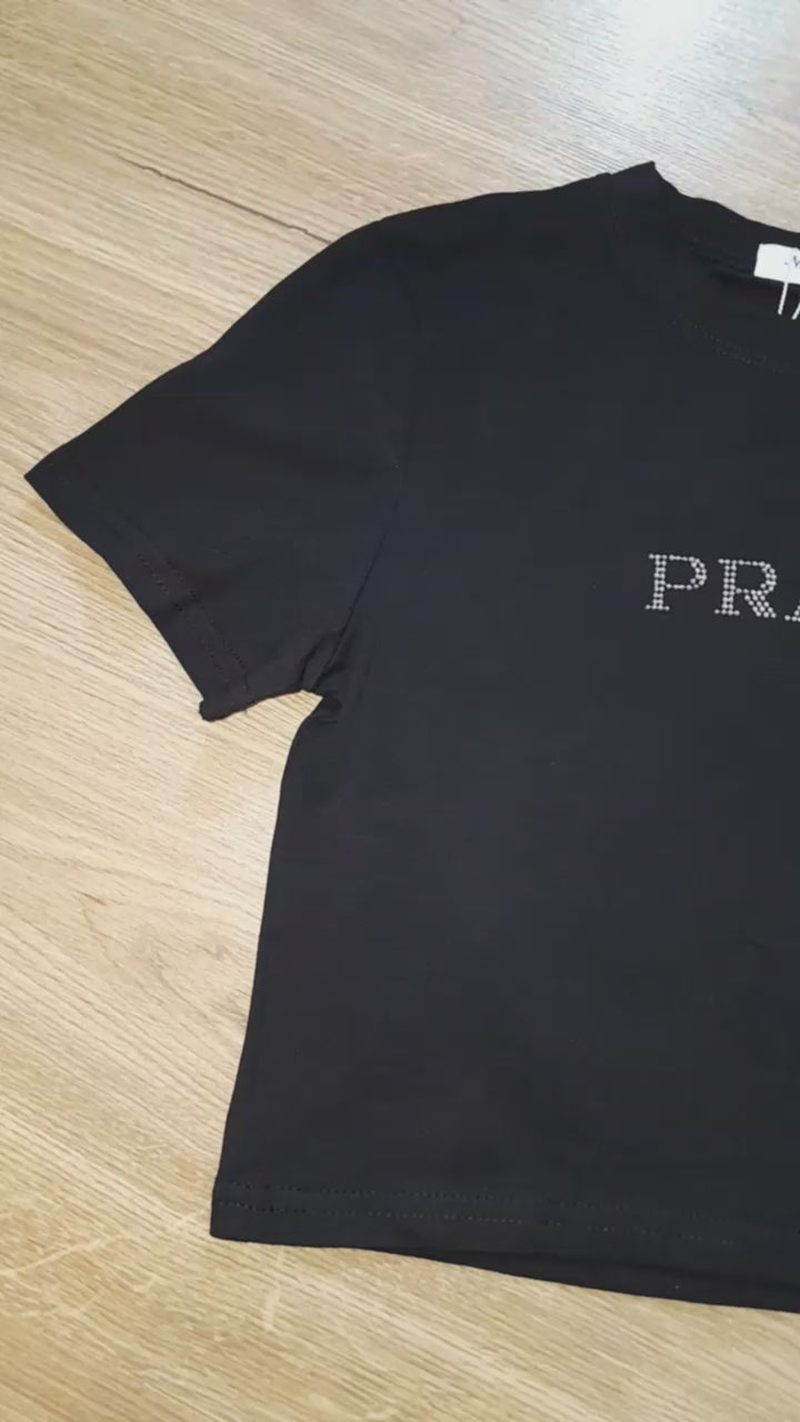 Este top crop de diseño esencial celebra el lujo discreto y el branding atemporal. Confeccionado en un tejido liso de tono negro intenso, su corte es impecable y moderno, con un cuello redondo pulcro y mangas cortas ajustadas que abrazan la silueta.