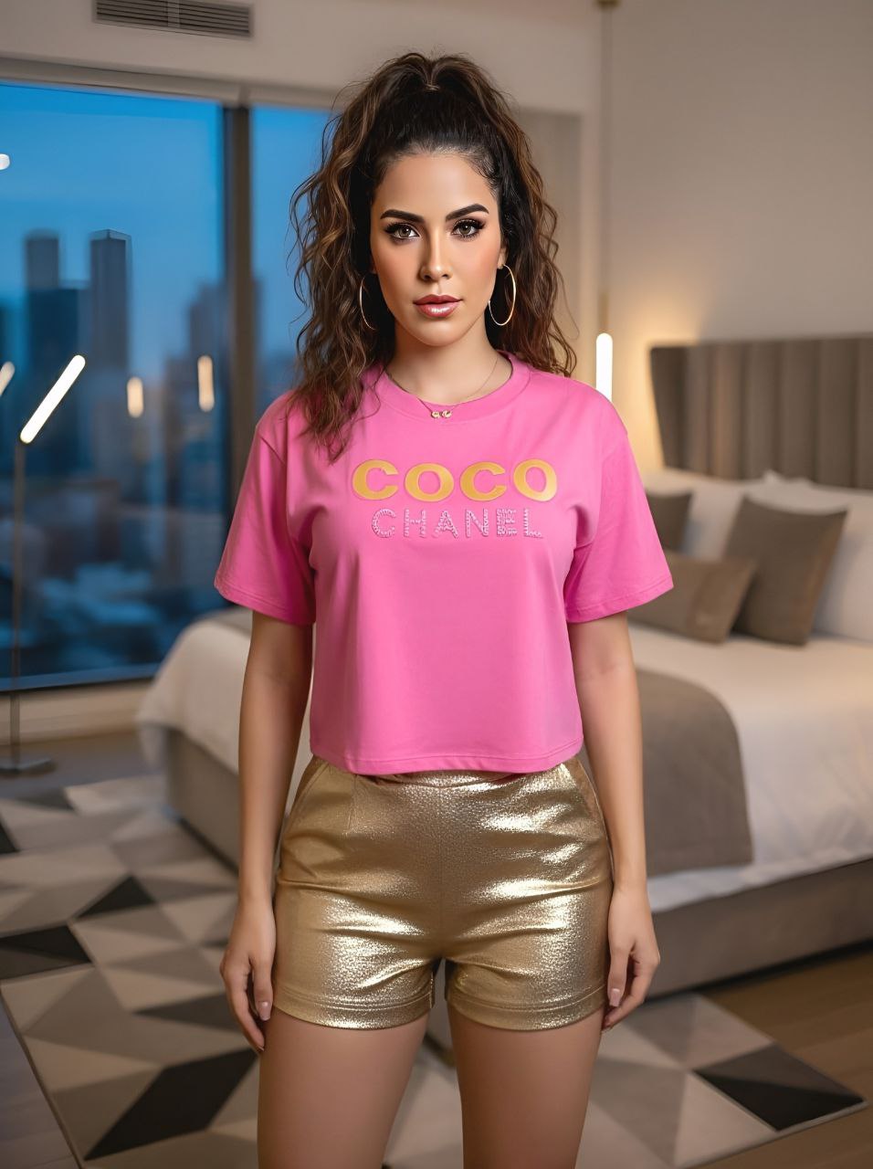 This is a cropped T-shirt in a vibrant and bold fuchsia or deep pink. It features a relaxed fit, slightly shorter than a traditional T-shirt, perfect for a modern look. A striking print of "COCO CHANEL" adorns the center of the chest. The word "COCO" is in a bold golden yellow, while "CHANEL" appears to be subtly embroidered or embossed in the same fuchsia shade as the fabric, creating a sophisticated, tonal effect. The garment has a round neck and short sleeves, offering a youthful and trendy feel with a touch of luxury.
