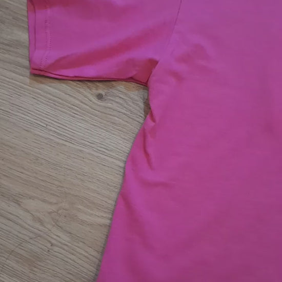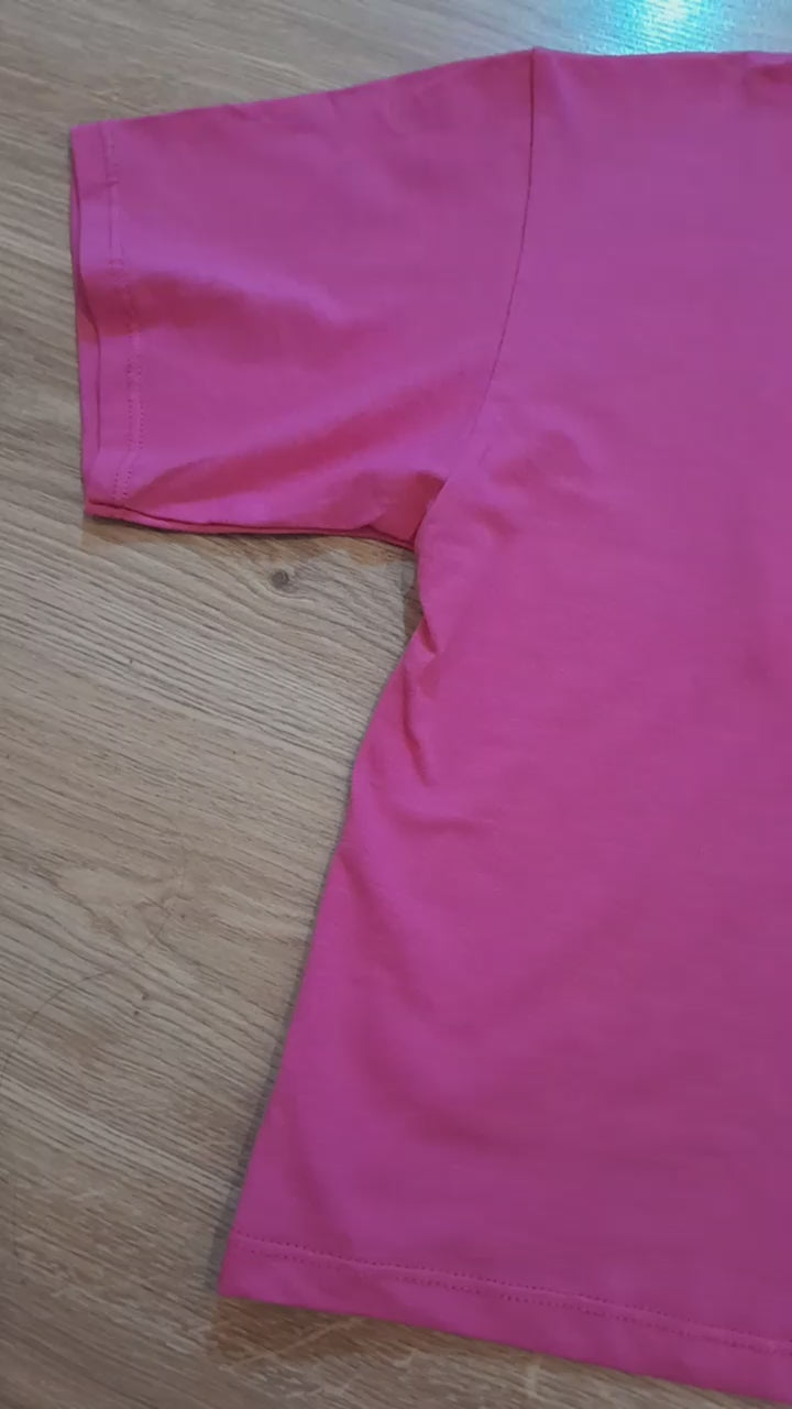 Esta es una camiseta (T-shirt) de estilo crop top en un vibrante y audaz color fucsia o rosa intenso. Presenta un corte relajado y ligeramente más corto que una camiseta tradicional, ideal para un estilo moderno. En el centro del pecho, luce un estampado destacado con las palabras "COCO CHANEL". La palabra "COCO" está en un color amarillo dorado llamativo, mientras que "CHANEL" parece estar sutilmente bordado o impreso en relieve en el mismo tono fucsia de la tela, creando un efecto tonal y sofisticado. La prenda tiene cuello redondo y mangas cortas, ofreciendo un aire juvenil y de tendencia con un guiño al lujo.