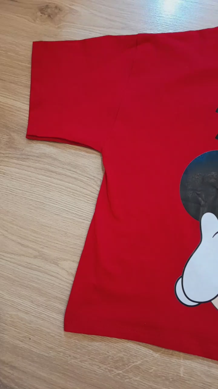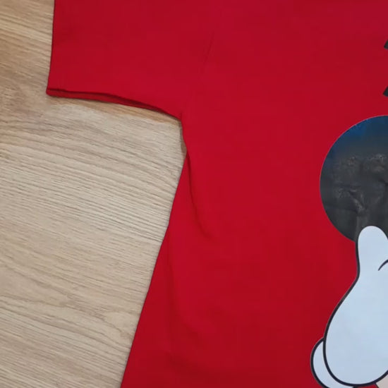 Esta es una camiseta (T-shirt) de estilo crop top en un audaz y vibrante color rojo. La prenda presenta un corte relajado y ligeramente oversized con mangas cortas. El elemento central es un gráfico grande y llamativo del personaje de Disney, Mickey Mouse, cubriéndose los ojos de forma juguetona. Sobre el dibujo, el nombre "MICKEY MOUSE" está impreso en negro y realzado con un efecto texturizado, brillante o con un patrón sutil que le añade un toque de glamour moderno. La combinación del rojo intenso y el estampado gráfico confiere a la camiseta un estilo divertido y chic a la vez.