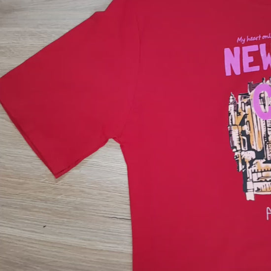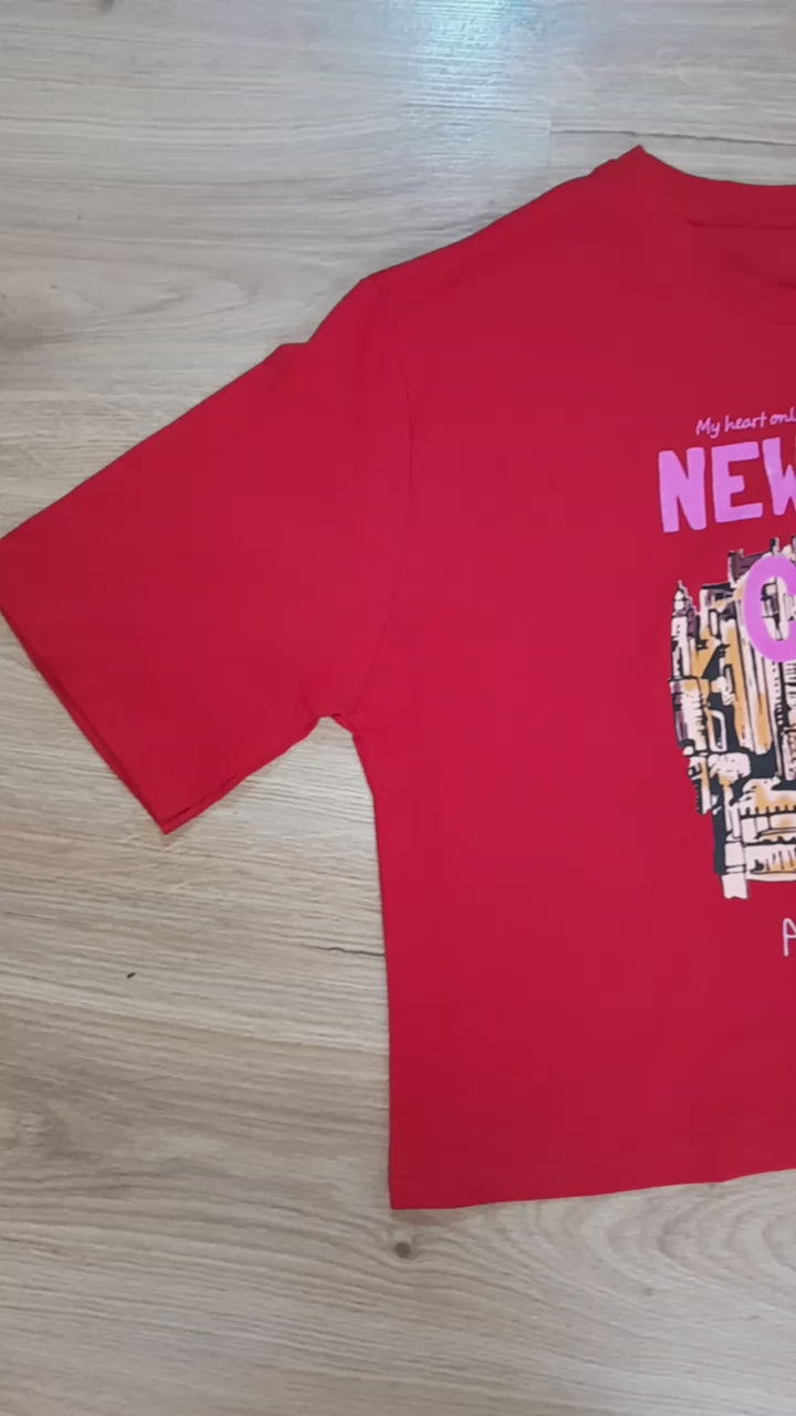 Esta es una camiseta (T-shirt) de corte relajado y estilo ligeramente crop en un vibrante color rojo. La prenda destaca por su estampado gráfico central que rinde homenaje a la ciudad de Nueva York. El diseño presenta una estilizada silueta del skyline en tonos que combinan el negro, dorado, y sutiles toques de rosa. Sobre el gráfico, el texto "NEW YORK" está prominentemente dispuesto en un color rosa contrastante. La camiseta tiene cuello redondo y mangas cortas, ofreciendo un estilo urbano, audaz y lleno de energía.
