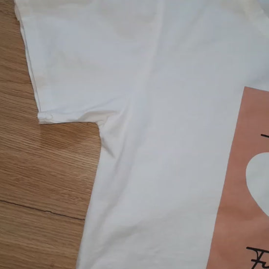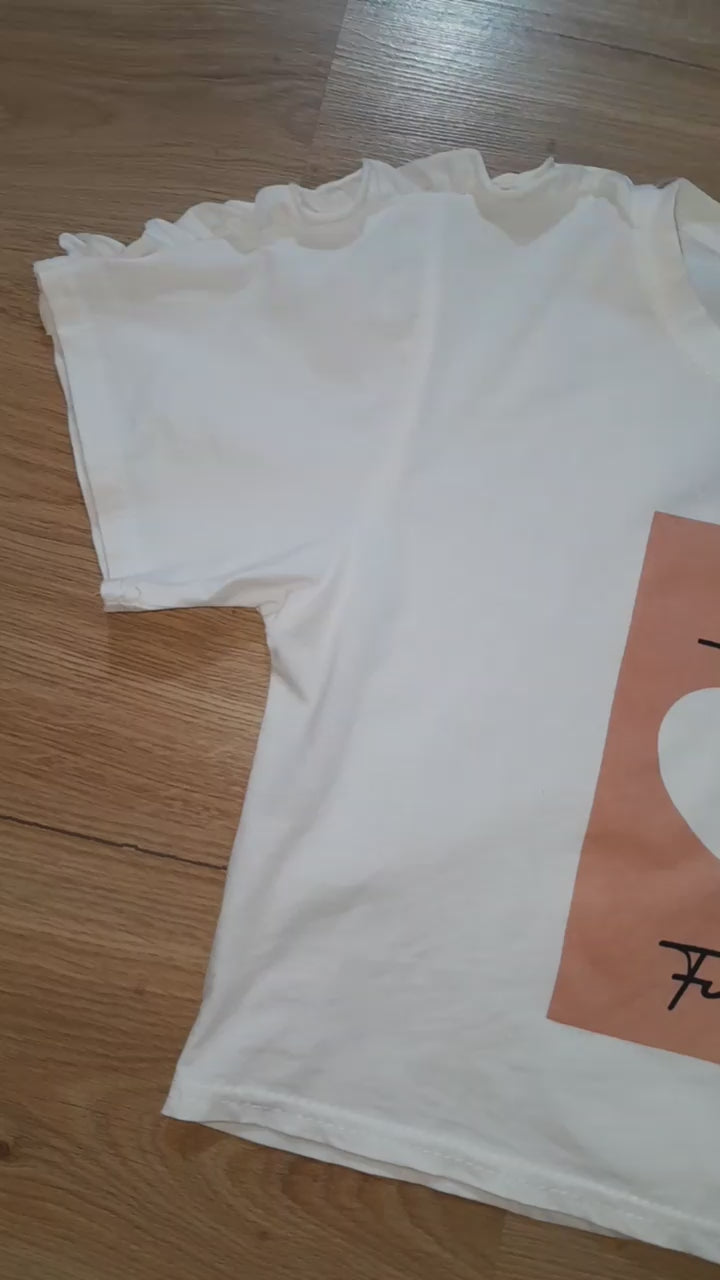 Esta es una camiseta (T-shirt) de estilo crop top en un impecable color blanco. Lo que distingue a esta prenda es el detalle femenino y delicado de las mangas, que están adornadas con pequeños volantes o fruncidos, aportando un toque romántico y suave. El diseño central presenta un gráfico moderno y minimalista: un gran corazón blanco centrado en un recuadro de color rosa empolvado o blush. Incluye también un texto estilizado que añade un mensaje dulce. Con su cuello redondo y el corte ligeramente por encima de la cintura, esta camiseta combina un aire juvenil y chic con la sofisticación de los volantes y la paleta de colores suaves.