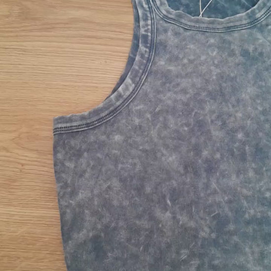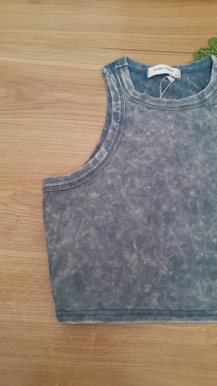 Esta es una sofisticada camiseta sin mangas (tank top) de estilo crop top. La prenda está confeccionada en un tejido que simula el efecto acid wash o tie-dye sutil, resultando en un atractivo tono azul grisáceo con un acabado ligeramente desgastado y texturizado. Presenta un corte ajustado y un cuello halter o nadadora que realza elegantemente los hombros. El diseño cropped y el acabado del tejido le confieren un estilo vintage y a la vez moderno y chic.