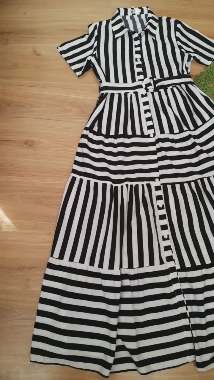 The long black striped dress is a versatile and elegant piece that suits a variety of occasions. With its timeless design, the stripes offer a classic touch that never goes out of style, while the black color adds an air of sophistication and formality. This type of dress is ideal for both casual events and more formal occasions, depending on the accessories you pair it with. Flat sandals and a straw hat can give it a relaxed, summery look, while heels and delicate jewelry can transform it into the perfect outfit for an elegant dinner. Plus, its length offers comfort and freedom of movement, making it a practical and chic option for any wardrobe.