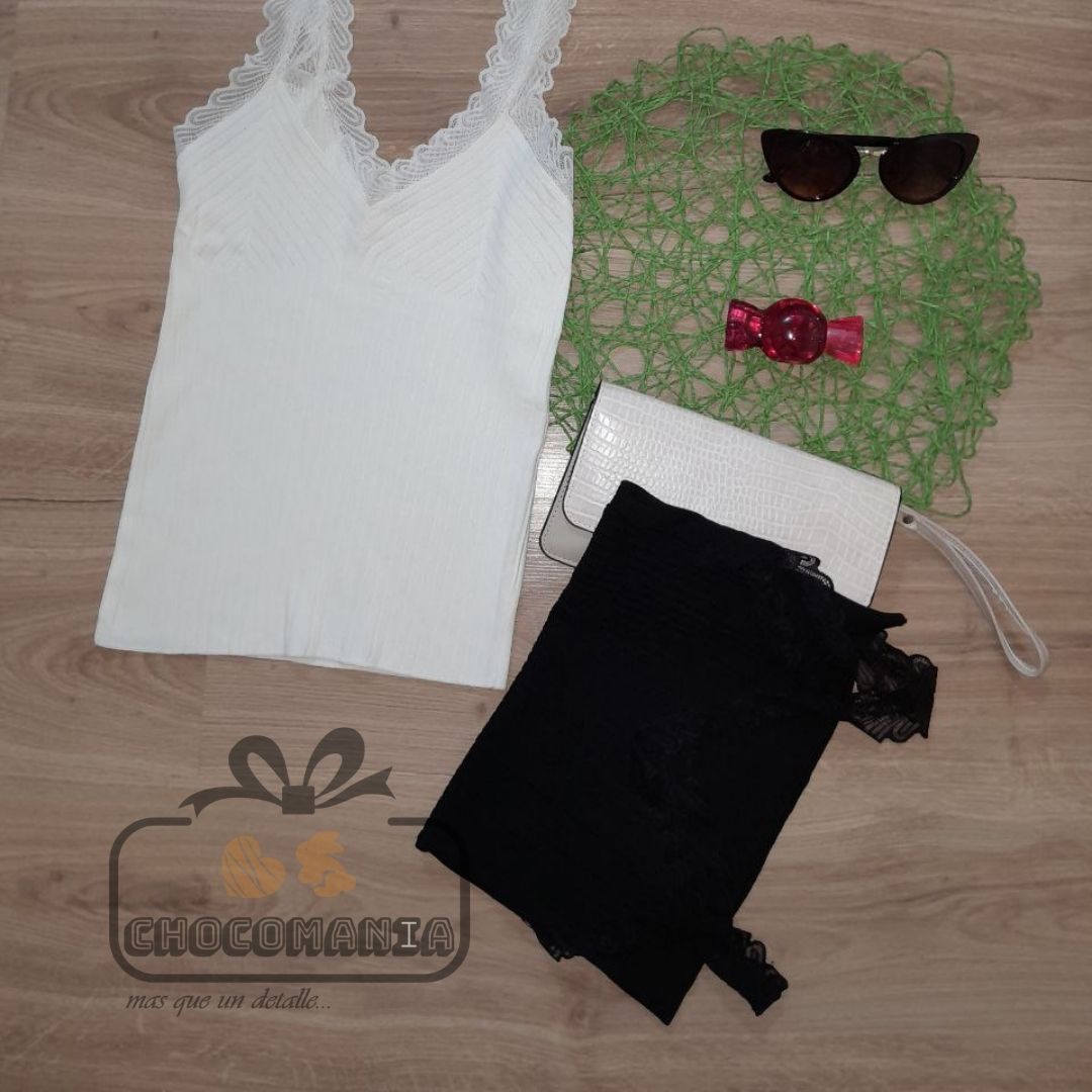 El es una prenda confeccionado en un tejido de punto acanalado o ribbed de alta calidad, que garantiza un molde ajustado que se ciñe elegantemente al torso. Su diseño se distingue por un delicado escote en 'V' que está finamente rematado con un encaje de patrón floral o crochet a lo largo de los bordes, incluyendo los tirantes, lo cual añade un toque de sofisticación y feminidad lencera a la pieza básica.