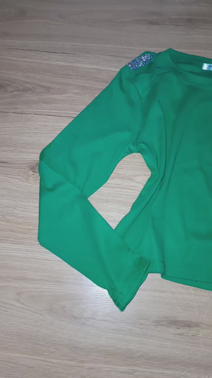 Esta es una elegante blusa de manga larga y estilo crop top. Presenta un corte minimalista y pulcro con cuello redondo. El rasgo distintivo de la prenda es la adición de hombreras decorativas adornadas con una hilera de brillantes o strass plateados, que recorren la costura del hombro. Este detalle de pedrería eleva la blusa, de apariencia sencilla, a una pieza sofisticada y glamurosa.