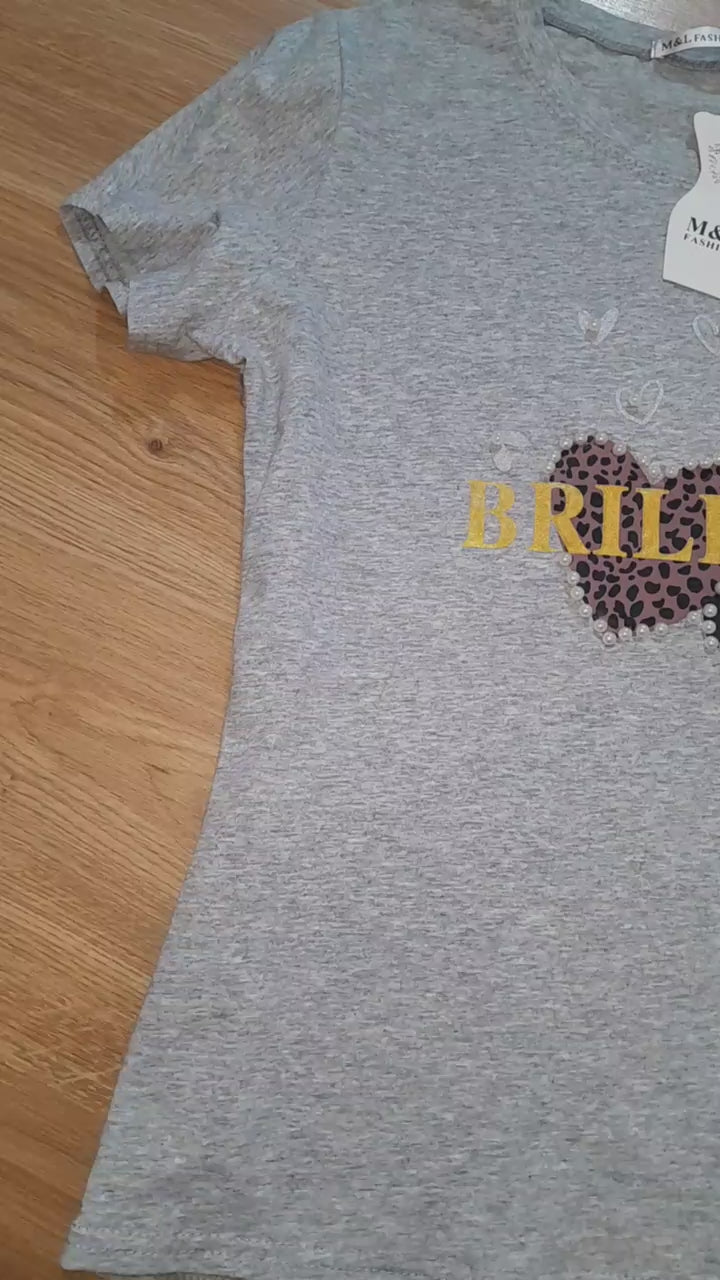 Esta es una camiseta (T-shirt) de corte clásico en un tono gris jaspeado o melange. La prenda se distingue por su estampado gráfico central que presenta la palabra "BRILLIANT" rodeada de un diseño de corazones superpuestos. Los corazones están embellecidos con detalles de texturas contrastantes: uno parece tener un patrón de leopardo (animal print) en tonos tierra y negro, y el otro es de un color negro sólido, posiblemente con un efecto aterciopelado o mate. El diseño incluye también pequeños adornos en color dorado que simulan ser studs o pequeñas joyas. El cuello es redondo y las mangas son cortas. En conjunto, es una prenda casual elevada, ideal para un estilo chic y contemporáneo.