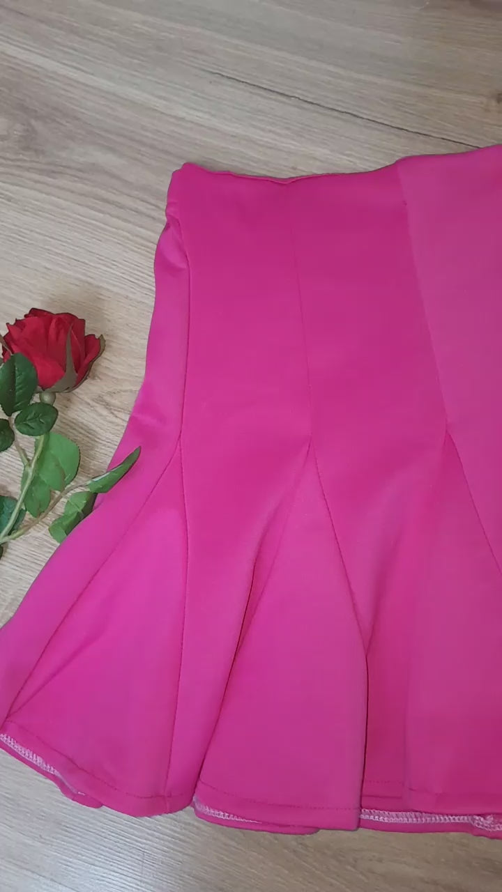 La falda es una pieza llamativa de un rosa vibrante y saturado que inyecta una energía audaz al conjunto. Confeccionada con un tejido que sugiere un movimiento fluido, presenta un diseño de pliegues sutiles y refinados que se abren ligeramente para crear una silueta acampanada y coqueta. Su largo mini es moderno y sofisticado, ofreciendo un equilibrio perfecto entre elegancia juvenil y dinamismo. Es una prenda que irradia alegría y confianza.