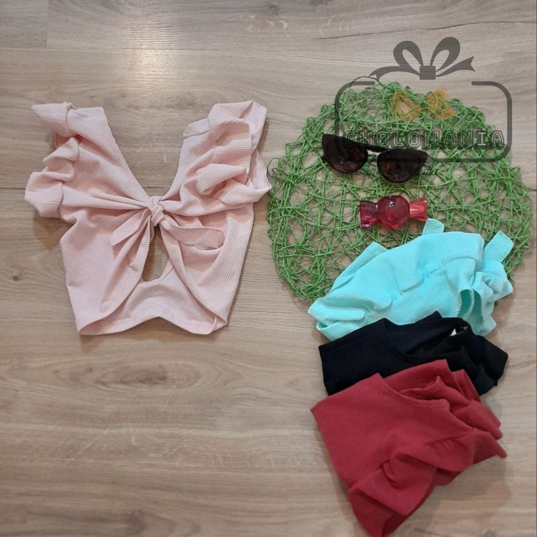Esta es una blusa corta o 'crop top' de estilo romántico y femenino. Está confeccionada en un tejido de punto elástico (posiblemente acanalado), y su diseño presenta un favorecedor escote en 'V'. El rasgo distintivo es el detalle frontal de nudo o lazo que ata la prenda en el centro del busto, creando un sutil efecto de fruncido y un toque pin-up chic. Además, las mangas cortas están adornadas con delicados volantes o 'ruffles', que añaden movimiento y una sofisticación etérea a la silueta entallada