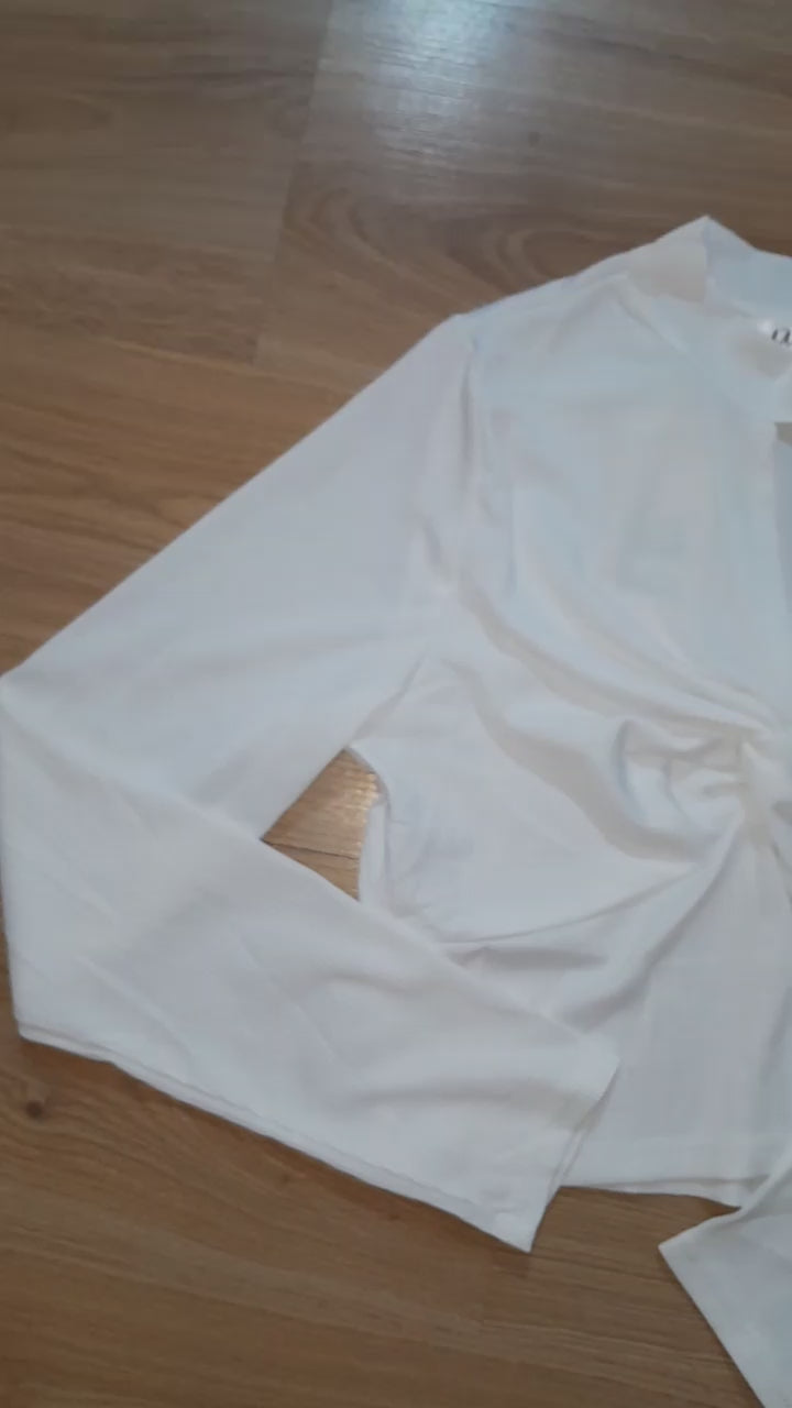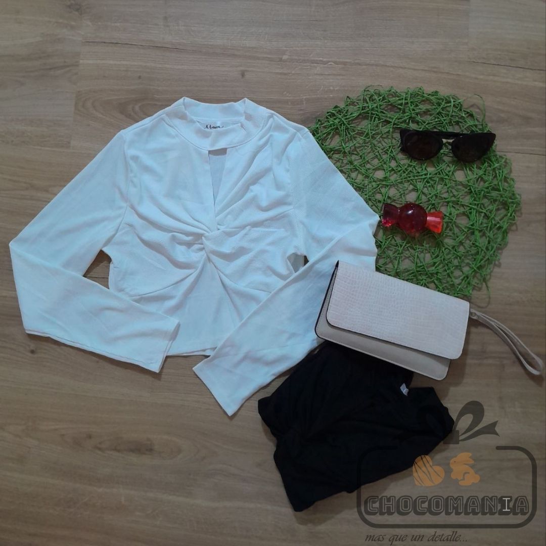 Esta es una blusa crop top sumamente elegante y moderna. Se caracteriza por un sofisticado diseño de cuello alto o simulado, que presenta un sutil cut-out en forma de lágrima justo debajo. El rasgo más distintivo es el detalle de torsión o nudo que se forma justo en el centro del busto, creando un efecto drapeado y estructurado que moldea y realza la silueta. La blusa cuenta con mangas largas y un corte ajustado al cuerpo, finalizando justo por encima de la cintura, lo que le confiere una apariencia pulcra y muy chic.