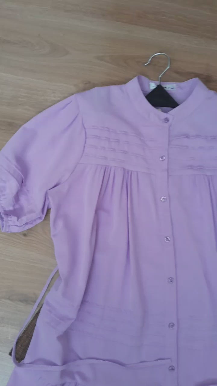 Un vestido lila de manga corta es una prenda versátil y elegante que puede ser adecuada para una variedad de ocasiones. Este tipo de vestido, con su color suave y femenino, es ideal para eventos casuales durante el día, como un almuerzo con amigos o una salida al parque, pero también puede adaptarse a situaciones más formales si se combina con los accesorios adecuados. La manga corta ofrece comodidad y frescura, especialmente en climas cálidos. Puedes complementar el vestido con un cinturón delgado para acentuar la cintura, y optar por sandalias o zapatos de tacón según la ocasión. Los tonos plateados o dorados en joyas pueden realzar el delicado color lila, creando un look sofisticado y armonioso.
